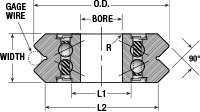 | انتخاب کنید | استعلام | Part No. | Bore | O.D. | Width | L1 | L2 | R | Gage Wire Diam. | Dynamic Radial Load Lbs. | Thrust Load | Static Radial Load | |||